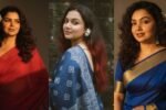“साउथ इंडियन साड़ी, चमेली के फूलों से सजे बाल, टेंपल बैकग्राउंड, क्लियर 4K इमेज।”